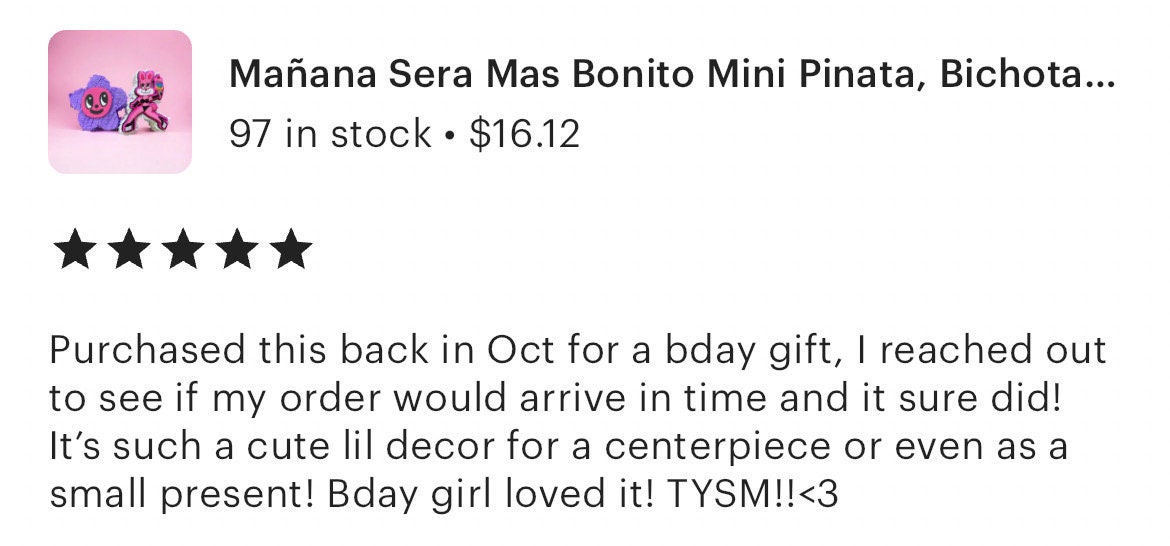 Amazing customer service and a really sturdy piñata! So cute, everyone loved it