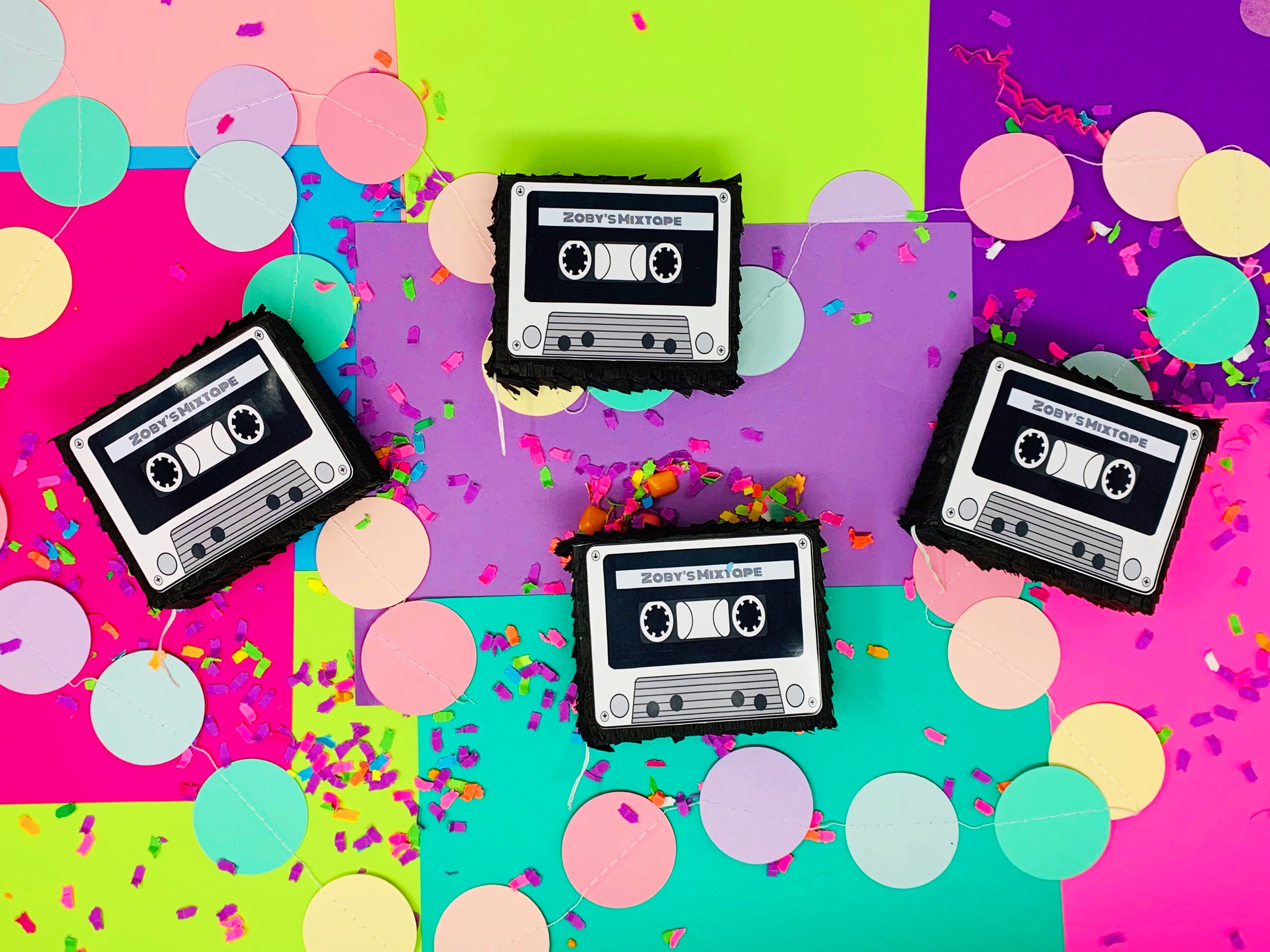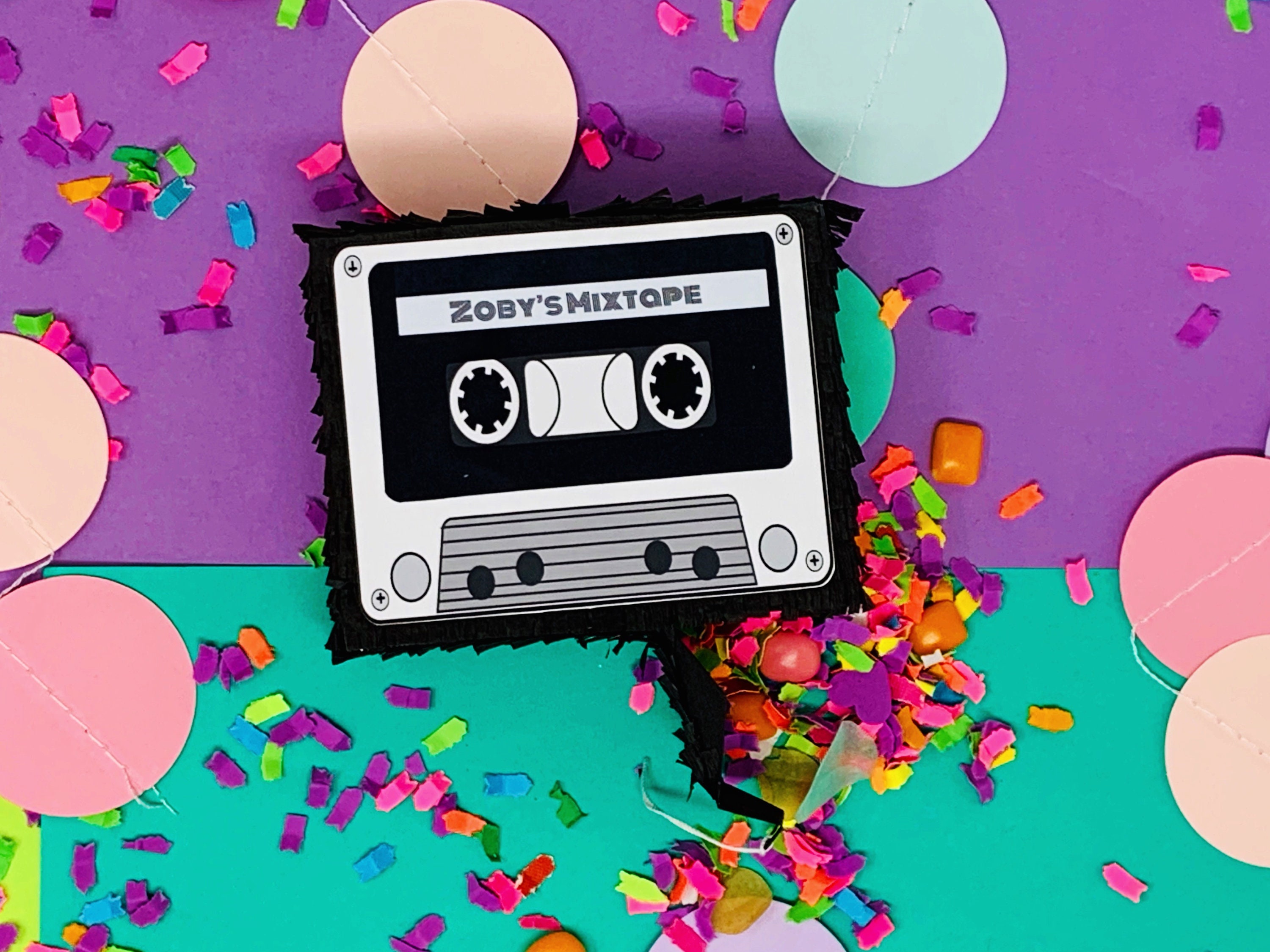 Add musical favors to your party with these adorable cassette piñatas. THESE ARE CUSTOMIZABLE IN TEXT AND COLOR!