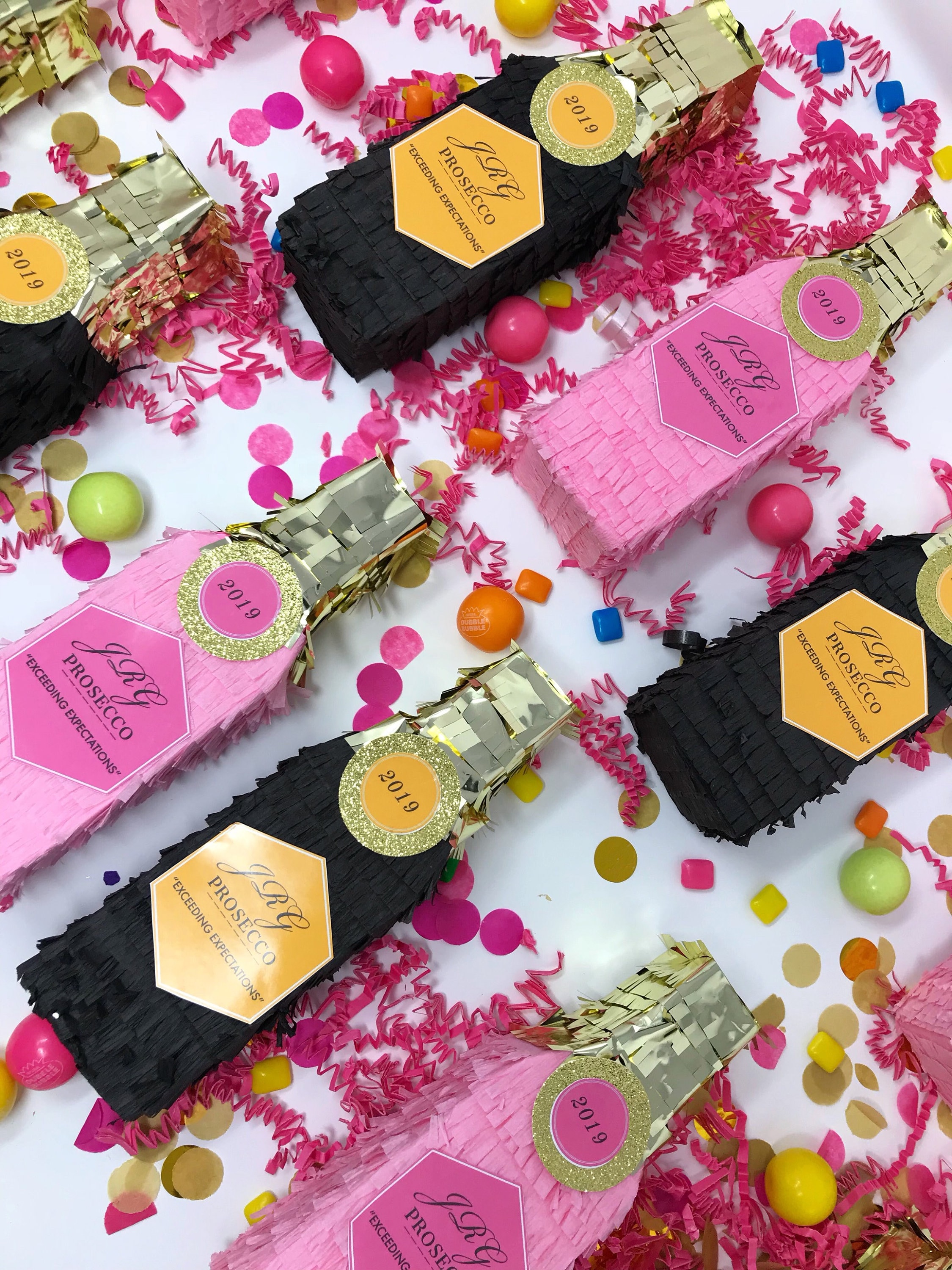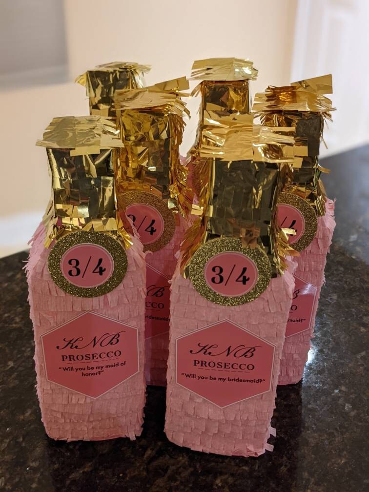 Pink Mini Champagne personalized pinata bottles are perfect way to pop the question to your bridesmaids in their proposal boxes and bridesmaid gifts. Use them as graduation gifts, retirement party favors, 21st party favors, in corporate events and more!